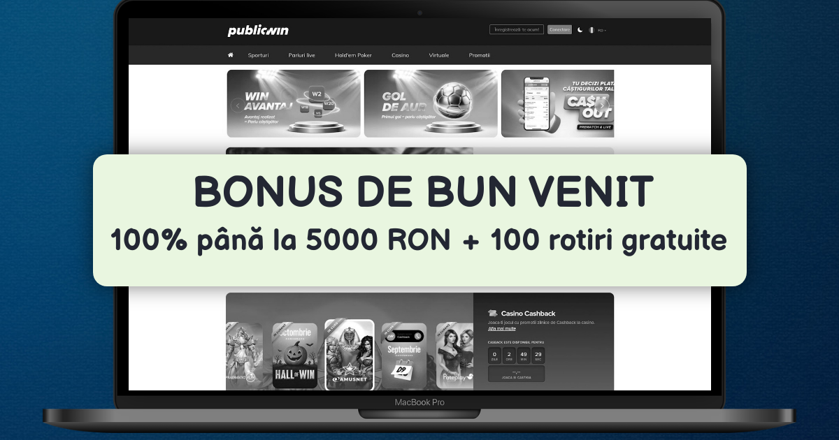 Bonusul principal pentru jucătorii noi constă într-o ofertă de 100% până la 1000 de lei la prima depunere, ceea ce înseamnă că suma pe care o depui inițial va fi dublată de către PublicWin. Această ofertă este una dintre cele mai competitive din piața românească, oferind jucătorilor o bază solidă pentru a-și începe experiența de joc.